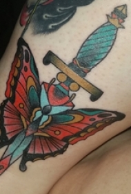 女生腿上彩绘线条匕首与蝴蝶刺青图案图片
