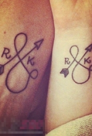 情侣手臂上黑色线条创意箭和花体英文刺青图案图片