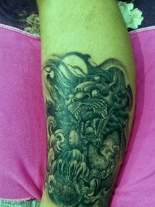 处在腿部霸气抢眼的貔貅纹身