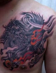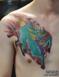男生前胸到肩膀处超酷的麒麟纹身图片