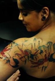 背部水彩风格彩色莲花和蜻蜓纹身图案