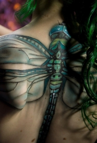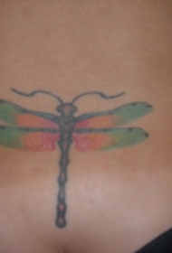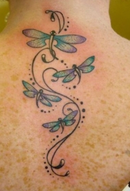 女生背部美丽的彩色蜻蜓花朵花朵纹身图案