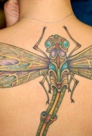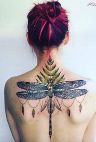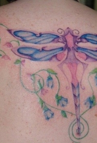 背部小清新彩色的植物与大蜻蜓纹身图案