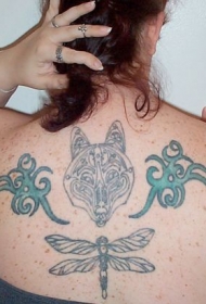 背部狼头与蓝色标志和蜻蜓纹身图案