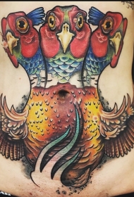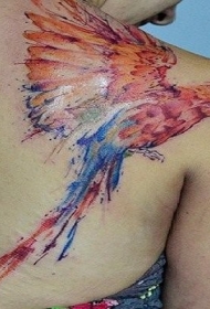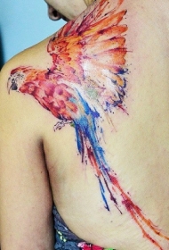 女生后背上彩绘渐变简单线条小动物鹦鹉纹身图片