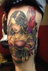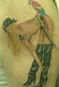 腿部彩色性感女海盗与鹦鹉纹身图案