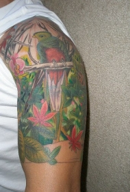 大臂纹身图 男生大臂上鹦鹉和风景纹身图片
