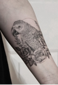 黑灰写实纹身 男生手臂上花朵和鹦鹉纹身图片