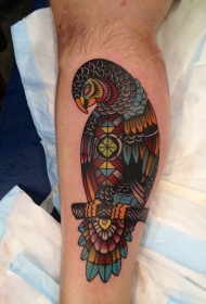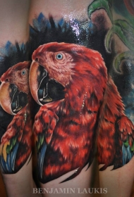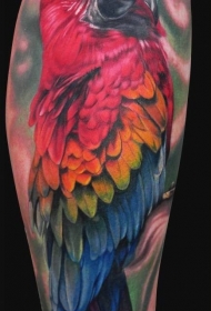 腿部彩色金刚鹦鹉和芙蓉花纹身图案