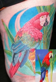 大腿逼真的彩色金刚鹦鹉和植物纹身图案