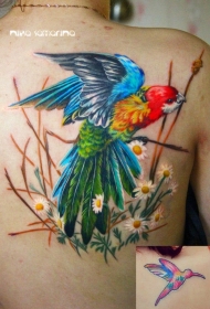 背部写实风格非常逼真的鹦鹉与花朵纹身图案