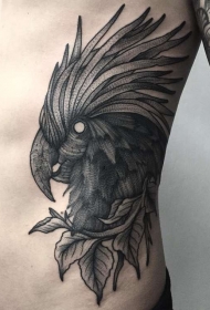 侧肋黑色个性鹦鹉头像和树叶纹身图案