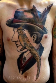胸部超现实主义风格的彩色人像与鹦鹉纹身图案
