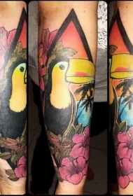 手臂彩色鹦鹉与花和棕榈树纹身图案