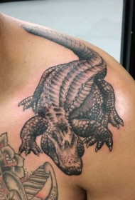 胸部令人印象深刻的黑灰鳄鱼与乌鸦纹身图案