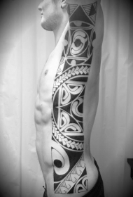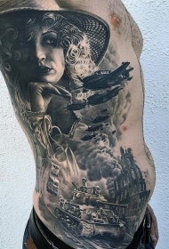 侧肋非常逼真的黑灰军事武器与女性肖像纹身图案