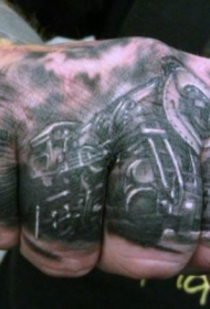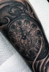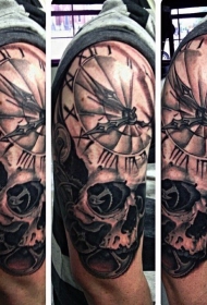 手臂逼真黑灰骷髅与旧时钟纹身图案