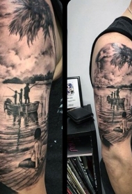 手臂梦幻般非常逼真的黑白捕鱼家庭纹身图案