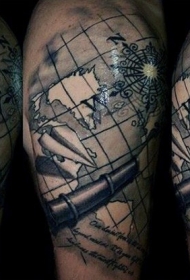 黑白航海世界地图与纸平面纹身图案