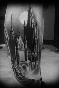 小腿写实幻想城堡黑白纹身图案