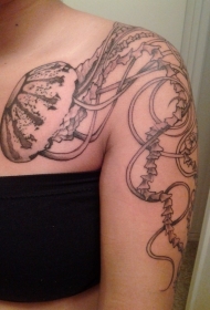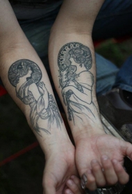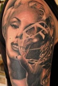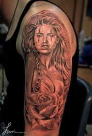 墨西哥式黑灰女人肖像与玫瑰大臂纹身图案