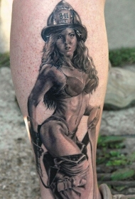 小腿写实黑白性感女消防员纹身图案