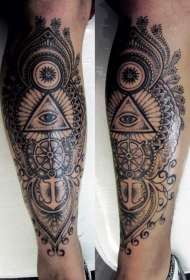 腿部黑色点刺船锚眼睛梵花纹身图案