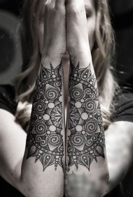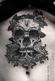 old school黑色点刺骷髅与符号花朵腹部纹身图案