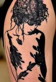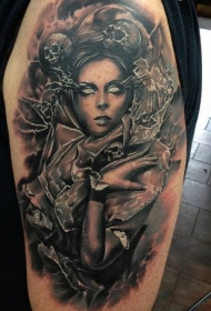 手臂令人毛骨悚然的黑白女性和骷髅纹身图案