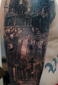 手臂令人毛骨悚然的房子与墓地骷髅纹身图案
