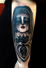 手臂黑白女人与圣心骷髅纹身图案