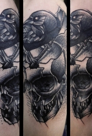 惊人的黑白点刺骷髅与乌鸦手臂纹身图案