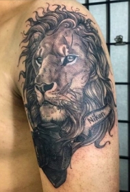 手臂黑白相机和字母狮子纹身图案