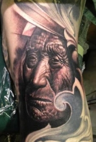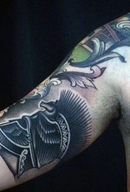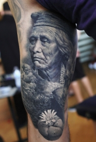 手臂写实黑白古老的印度人肖像和老鹰花朵纹身图案
