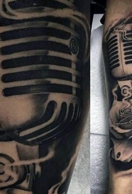 黑白色玫瑰花与麦克风写实手臂纹身图案