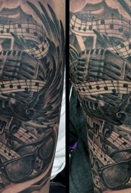 黑白麦克风与五线谱和眼镜手臂纹身图案