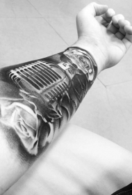 欧美写实风格麦克风和玫瑰手臂纹身图案