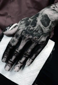 手背令人毛骨悚然的黑白骷髅骨架纹身图案