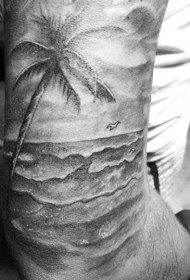 手臂非常写实的黑白海岸与棕榈树纹身图案