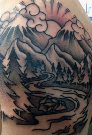 手臂河流与森林黑白纹身图案