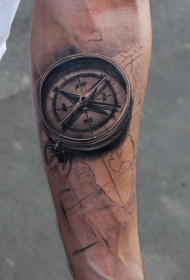 华丽的黑白写实指南针与地图手臂纹身图案