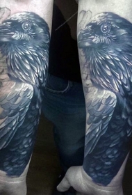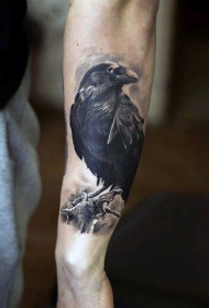 手臂非常写实的黑白乌鸦纹身图案