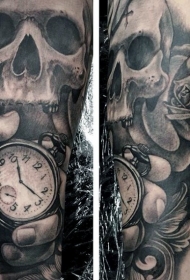 神秘设计的黑白骷髅与花朵时钟手臂纹身图案