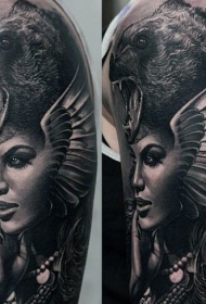 手臂写实风格的黑白幻想女子和狼纹身图案