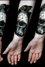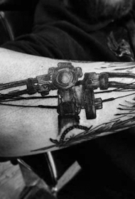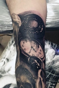 手臂非常逼真的黑白羽毛和钥匙玫瑰时钟纹身图案