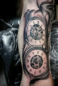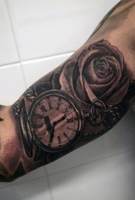 非常逼真的黑白时钟与玫瑰手臂纹身图案