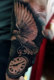 非常逼真的黑白鸽子与破碎时钟手臂纹身图案
