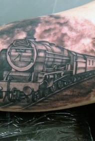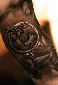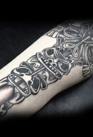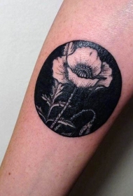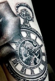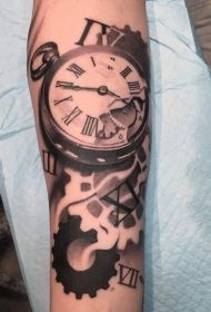 非常逼真的黑白机械时钟与花朵手臂纹身图案