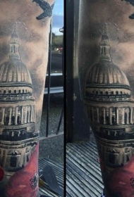 手臂精确设计的黑白中世纪城堡与骷髅纹身图案
