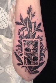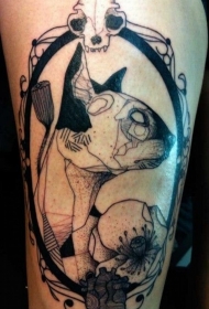 手臂个性的黑白猫与花朵骷髅抽象纹身图案